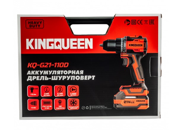 Шуруповерт KINGQUEEN 21В, 110 Нм, бесщеточный, ударный, патрон 13мм, KQ-G21-110D