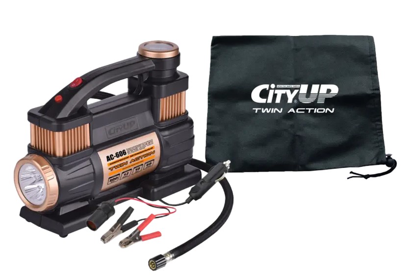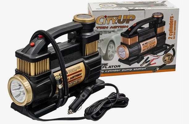 Мощный двухцилиндровый автомобильный компрессор поршневого типа для подкачки шин автомобилей, в том числе CUV, SUV, 4х4, MPV, VAN, PickUP, мототехники, хозяйственного и спортивного инвентаря.