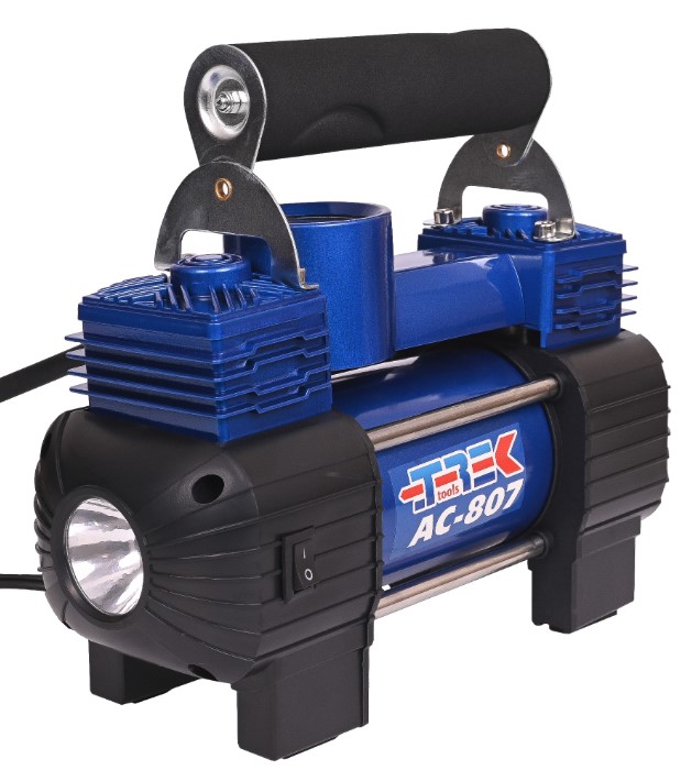Двухпоршневой автомобильный компрессор с фонарём в удобной сумке.