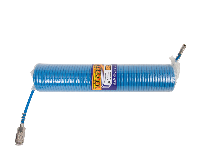 Пневматический спиральный полиуретановый шланг высокого давления — обеспечивает стабильное поступление сжатого воздуха от компрессора к инструменту. Устойчив к воздействию бензина, масла, растворителя, а также не теряет своих свойств при пониженной и повышенной температуре воздуха