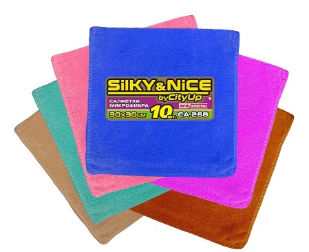Шелковая. Набор разноцветных салфеток из микрофибры, 10 шт. Шелковый ворс. Прекрасно впитывают воду, масла, пыль, грязь. Легкая и приятная уборка дома, офиса, автомобиля. Применение: как в сухом , так и во влажном виде.
